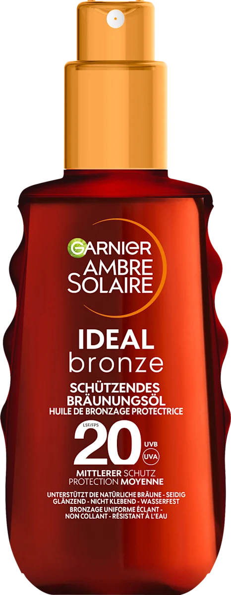 Garnier Ambre Solaire Ideal Bronze Sun Protection Oil SPF30 helps to protect your skin against UVA and UVB rays. This non-sticky and water resistant formula is enriched with nourishing Shea butter and helps to achieve a natural glow. Tested under dermatological control. Formula conforms 100% to European recommendations for protection against the harmful effects of UVA and UVB rays