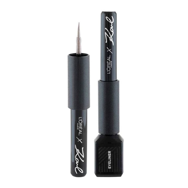 Create a statement rock-chic eye look with the Karl Lagerfeld X L’Oreal Paris Matte Eyeliner. This limited-edition liquid liner from L’Oreal Paris and Karl Lagerfeld collection delivers bold colour in just one swipe that dries to a long-wearing, waterproof finish. The liquid eyeliner delivers a metallic finish to provide instant attitude and drama. An ergonomic finger grip design and a short stem allow for a controlled application and a precise finish. Showcase your style with this metallic, highly pigmented formula.